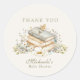 Gender neutral baby shower thank you sticker with vintage books and watercolor botanical design adds a timeless and elegant finishing touch to your celebration. Featuring soft muted sage “Thank You” lettering paired with a charming stack of classic storybooks topped with a sweet baby accent, this round baby shower favour sticker captures a refined literary theme perfect for a neutral baby shower. The gentle earth tone typography blends beautifully with delicate greenery and airy watercolor florals, creating a woodland inspired aesthetic that feels warm, sophisticated, and beautifully coordinated. The soft neutral background enhances the sage accents and botanical details, allowing the design to complement rustic, garden, vintage, or classic baby shower décor. Ideal for sealing favour bags, decorating treat boxes, embellishing thank you gifts, or adding a polished detail to party favours, this neutral baby shower thank you label ties together invitations, plates, napkins, and welcome signs with cohesive style. The elegant serif and script typography combined with subtle floral accents create a keepsake worthy presentation for guests. This literary themed baby shower thank you sticker delivers understated charm, coordinated décor, and a beautifully styled finishing touch for a meaningful celebration.