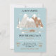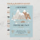 A new home for the holidays House Warming party invitations. Fun and funky with retro inspired fonts and design. Features a mountain range with snow, trees and a car pulling up to the cute cottage. Nordic feel adds to the atmosphere with the natural neutral colours of rust, black, white, grey and tan palate. The back is a fun modern graphic dotted pattern.