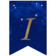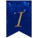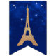 Chic Paris themed bunting banner with each flag done in a dark blue, with sparkles and stars. Gold glitter graphic text spells out A NIGHT IN PARIS, with a gold glitter Eiffel Tower taking the place of the letter A. Matching Sweet 16 Paris themed party invitation and supplies available.