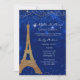 Elegant Paris themed Sweet 16 Birthday Invitation, done in a blue background with star like sparkles, gold confetti, and a gold glitter looking Eiffel Tower. Personalise the custom white text, for your daughter's 16th birthday celebration. Matching products available.