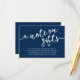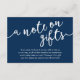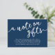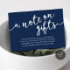 Celebrate the beginning of your journey together with our elegantly rustic modern navy blue theme, crafted "A note on gifts" wedding invitation enclosed card, wish, cash. Featuring a sophisticated blend of modern script and romantic allure, each card is meticulously designed to convey the essence of your special day. Perfectly suited for couples seeking a unique way to share their honeymoon dreams, this card invites your loved ones to contribute towards unforgettable experiences. Whether nestled in a luxurious envelope or presented alongside your wedding invitations, our card adds a touch of enchantment to your celebration, promising cherished memories that last a lifetime. Designed by TeeshaDerrick.