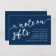 Celebrate the beginning of your journey together with our elegantly rustic modern navy blue theme, crafted "A note on gifts" wedding invitation enclosed card, honeymoon fund, wish, cash. Featuring a sophisticated blend of modern script and romantic allure, each card is meticulously designed to convey the essence of your special day. Perfectly suited for couples seeking a unique way to share their honeymoon dreams, this card invites your loved ones to contribute towards unforgettable experiences. Whether nestled in a luxurious envelope or presented alongside your wedding invitations, our card adds a touch of enchantment to your celebration, promising cherished memories that last a lifetime. Designed by TeeshaDerrick.