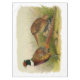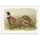 Coloured Drawing of a Ring Necked Pheasant rooster looking over his hen while she pecks for seeds in the clearing of a grass filled prairie. The Rooster is a rainbow of colours including green, yellow, oranges, blues, browns and whites. A pretty Upland Game bird.