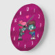 A clock A cute illustration with a zombie couple, arms reaching out towards each other. A pink heart above their heads. Set on a dark magenta background. Cute and adorable while also creepy and fun.