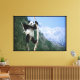 A Panda In a tree poster.has a black and white panda standing up at the top of a tree with a mountain view behind him and a blue sky.this is a beautiful photo.. on this Wrapped Canvas