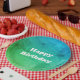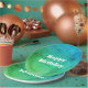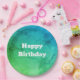 Teal, and green paper plates, happy birthday themed text can be personalised to any special event.