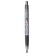 A pen with a multicolored geometric pattern on the barrel, featuring black grip and silver accents. The pen is displayed from front and bottom views against a white background.