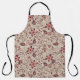 A person wears a floral-patterned apron with swirling vines, vibrant red, pink, and black flowers on a light beige background, conveying a cheerful tone.