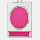 a pink background with a black border silver plated banner ornament