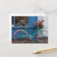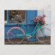 A pink bicycle with wicker basket and flowers postcard