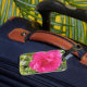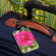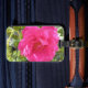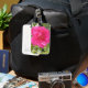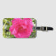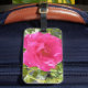 A Luggage Tag with a Picture of a Pink Rose on it.