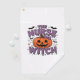 A playful design featuring a pumpkin witch with a golf towel