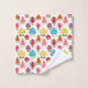 This towel set has a mid-century modern design of flowers made from squares, ovals, and diamonds that have been manipulated to form flowers.