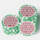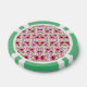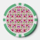 A poker chip with a floral pattern in pink and green with geometric accents on both sides, creating a vibrant and playful design.