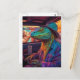A psychedelic lizard in a vehicle postcard