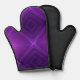 "A purple oven mitt with a quilted diamond pattern on the front and a solid black back. The mitt has black edging and a hanging loop."