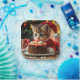 An adorable tabby kitten, dressed in a festive red Santa suit, gazes intently at a small, decorated chocolate cake. A single lit candle sits atop the cake, suggesting a birthday celebration or a Christmas wish. The kitten's bright eyes and the warm, bokeh-filled background create a heartwarming holiday scene.