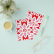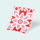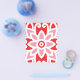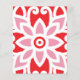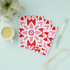 The design features a symmetrical pattern with a combination of red and white colours. At the centre, there’s a stylised floral design with layers of petals radiating outward. Surrounding this central motif are swirling elements and additional decorative shapes, creating a balanced and harmonious look. The use of just two colours makes the intricate design stand out beautifully.