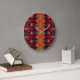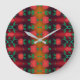 A designer clock with a red and black a bold floral print.
