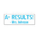 This positive rubber stamp design features the message "A+ RESULTS!" and a custom teacher's name. It could be used by a teacher, educator, or tutor when grading student work, to acknowledge that a student has done an exceptional job.