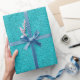 a roll of textured teal wrapping paper with a subtle sheen, curled at one corner to reveal a white interior tube, set against a plain white background