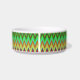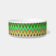 A round bowl with a colorful zigzag pattern featuring vibrant greens, blues, yellows, and reds on the side. The interior is plain white.