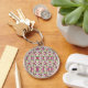A round keychain features a detailed floral pattern in pink, green, and cream. It's shown on a light surface, with keys and a phone nearby, conveying elegance.