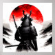 -The Poster Features A Samurai Warrior In Traditional Armour, positioned with their back towards the viewer. The armour is detailed and layered, displaying intricate patterns and a mix of dark metallic textures. The samurai holds a long, curved sword in one hand, angled slightly away from their body. The background consists of a large, vivid red sun amidst a grey, cloudy sky, with some areas of the sky and sun appearing to bleed red ink down the scene, giving it a dramatic, somewhat ethereal effect. The overall tone of the image is both powerful and sombre, accentuated by the monochrome colour palette with the stark contrast of the red sun.