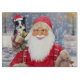 A santa claus holding a cute Border Collie and chr Cutting Board