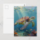 A sea turtle themed postcard with an illustration of a sea turtle under a calm teal sea swimming among the coral on the front.