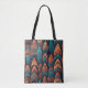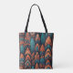 A seamless pattern of colourful abstract feather-like shapes in shades of blue, orange, and teal against a dark background. The shapes have intricate geometric and tribal-inspired designs, creating a vibrant and dynamic repeating pattern tote bag