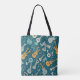 A seamless pattern featuring various musical instruments such as guitars, saxophones, trumpets, and other string and wind instruments in shades of orange, yellow, and teal on a dark teal background tote bag