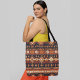 A seamless repeating pattern with geometric shapes and tribal motifs in warm orange, brown, and black colours tote bag