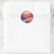 A stylised circular illustration of a river valley at sunrise, chraacterised by distinct linework and textures.