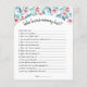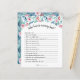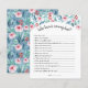 A sheet of paper with the game "Who knows mummy best?" for a baby shower, decorated with adorable watercolor paintings of plants with soft pastel emerald and blue leaves, branches and soft pink roses.