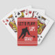 For the ultimate hockey lover. This deck of cards has a silhouette of a hockey player on a red background, with double with stripes at the top and bottom. The text that read "LET'S PLAY!" can be customised with a name, date or special occasion. The stripes and background colour can also be customised.