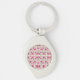 A silver teardrop keychain with a round pink and white floral pattern. It's shown close-up on a white background and placed beside a phone and notebook.
