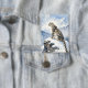 A pretty wildlife button with an illustration of a majestic snow leopard perched on a craggy, snow-covered peak, gazing out at a vast, frozen mountain range.