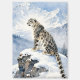 A pretty wildlife Keychain with an illustration of a majestic snow leopard perched on a craggy, snow-covered peak, gazing out at a vast, frozen mountain range.