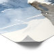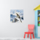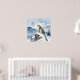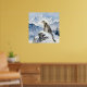 A pretty wildlife wall art poster with an illustration of a majestic snow leopard perched on a craggy, snow-covered peak, gazing out at a vast, frozen mountain range.