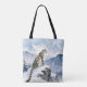 A pretty wildlife tote bag with an illustration of a majestic snow leopard perched on a craggy, snow-covered peak, gazing out at a vast, frozen mountain range.