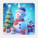 A cheerful snowman takes centre stage in this vibrant Christmas scene. He's bundled up in a red and white scarf and topped with a fuzzy blue hat. His carrot nose and coal smile radiate warmth. He stands proudly beside a beautifully decorated Christmas tree, surrounded by colourful presents adorned with bows and ribbons. A miniature snowman with a Santa hat sits nearby, adding to the festive atmosphere. A charming snow-covered house with glowing windows peeks out from behind the gifts, completing the picture of holiday magic. The backdrop of a twinkling blue sky and falling snowflakes enhances the overall enchantment.