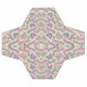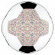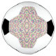 A soccer ball featuring black and white panels with intricate, colorful patterns in pink, green, and blue. The pattern includes swirling abstract designs. Below, a flat view of the patterned panel shows the detailed symmetrical design, enhancing the artistic and playful tone of the ball.