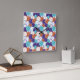 A square wall clock with overlapping clock faces in orange, purple, and teal patterns, featuring black hour and minute hands in the center. The design gives a vibrant, busy feel.