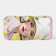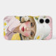 A stylish vintage-inspired portrait on a pink floral phone case featuring a glamorous blonde woman in a hat, with pink cheeks and red lips. Elegant and artistic design for fashion lovers.