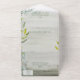 Elegant watercolor leaves all in one Wedding invitation that includes the wedding info and RSVP postcard that your guests tear off and send. Envelopes are not needed. Colours of golden yellow, charcoal grey, blues, and shades of green. Great for an outdoor Summer, Fall, Boho, Barn, or mountain wedding!