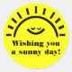 A bright yellow background with a smiling sun with the caption "Wishing you a sunny day"