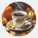 Pretty Fall themed stickers to seal your envelopes or decorate your notebooks with an ai illustration of an Autumn scene with a cup of warm coffee, orange slices, pumpkins and Fall leaves.