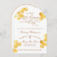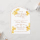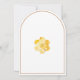 A charming and elegant honey bee-themed baby shower invitation. The arch-shaped design showcases a delicate watercolor yellow honeycomb pattern, beautifully adorned with playful, stylised honeybees nestled within the hexagons. The phrase "A Sweet Little Honey is on the Way" is elegantly rendered in a graceful script font. The front of the invitation boasts a clean, refined layout, while the reverse side features a honeycomb pattern cleverly arranged in the shape of a flower. At the heart of the design, a monogrammed initial is framed by a delightful honeybee, adding a whimsical touch to this sweet and sophisticated invite. All illustrations contained in our honey bee baby shower invitation are hand-drawn original artwork by © Moodthology Papery