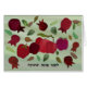 Graphic illustration of pomegranates, apples, and leaves. Hebrew translation of L'Shanah Tovah Umetuka: Wishing you a sweet, good year for the Jewish New Year. Hebrew translation of L'Shanah Tovah Tikatevu Vtehatemu: May you be inscibed and sealed for a good year. Blessings are said on apples dipped in honey symobolizing a sweet year and that our merits should be as numerous as the seeds of a pomegranate.